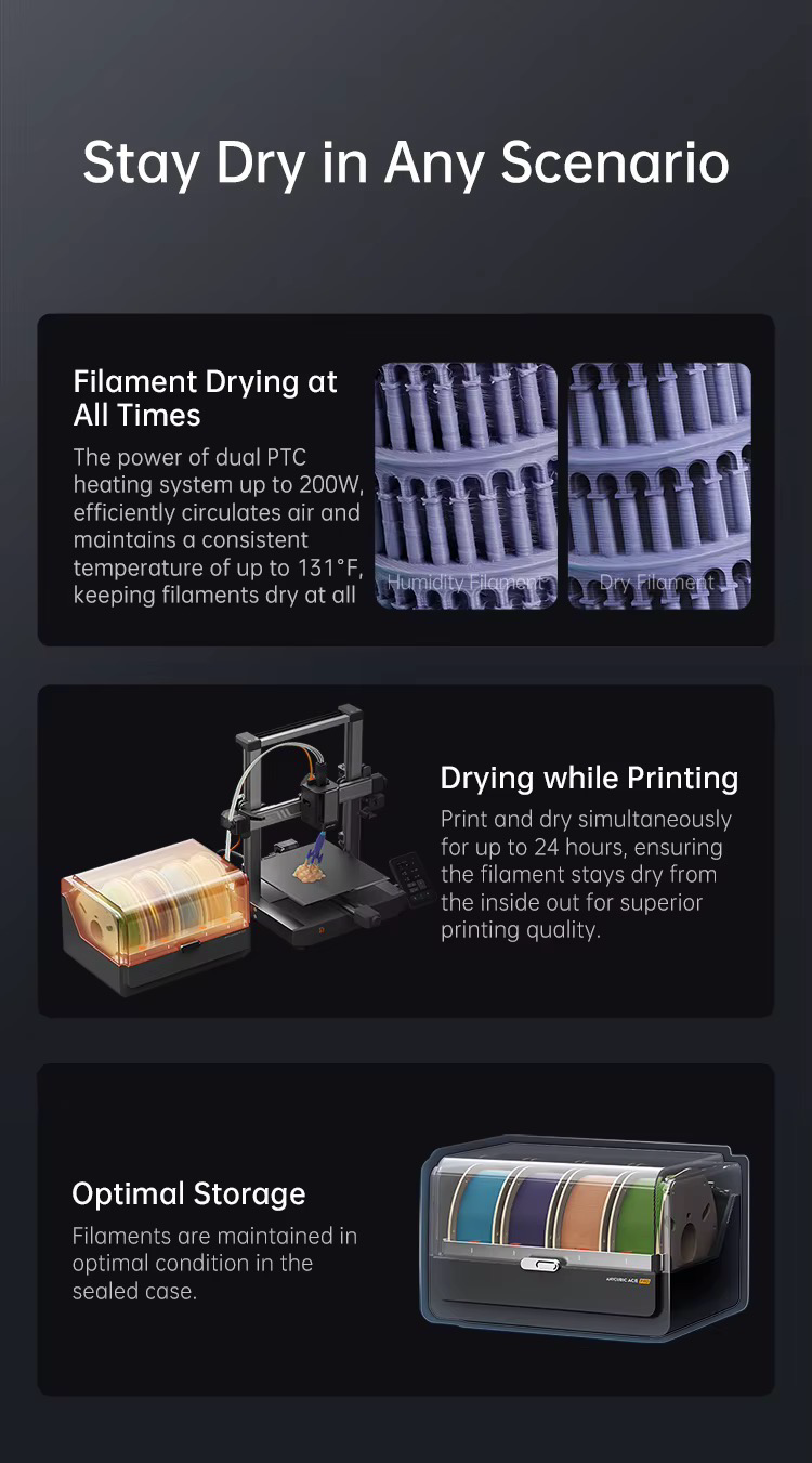 The power of dual PTC heating system up to 200W, efficiently circulates air and maintains a consistent temperature of up to 55°C, keeping filament dry at all times. Print and dry simultaneously for up to 24 hours, ensuring the quality of the printed model.