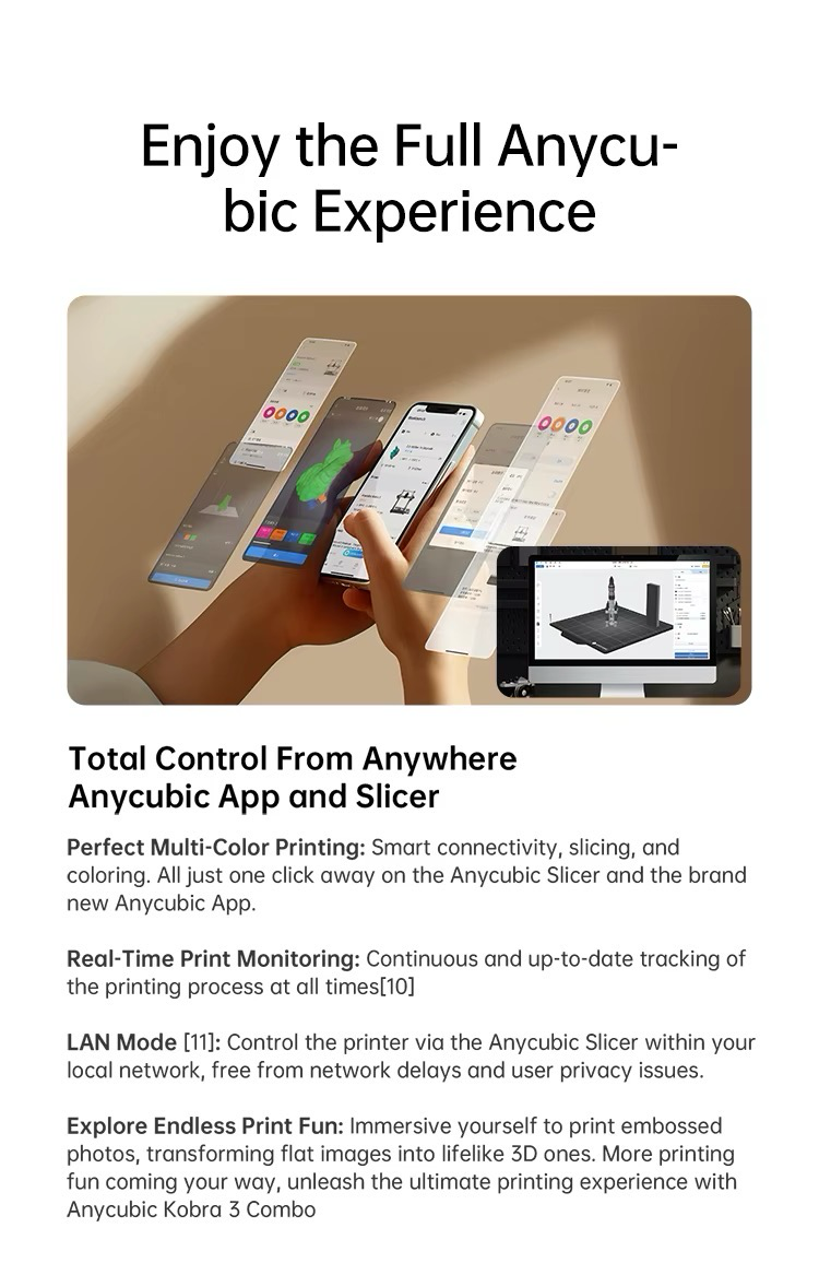 By integrating a four-color print system (with support for up to eight spools), the Kobra 3 Combo simplifies multi-color (or multi-material) printing, eliminating the need for extensive workflow adjustments. Immerse yourself in a world of vibrant colors, and fully explore your creative ideas in multicolor.