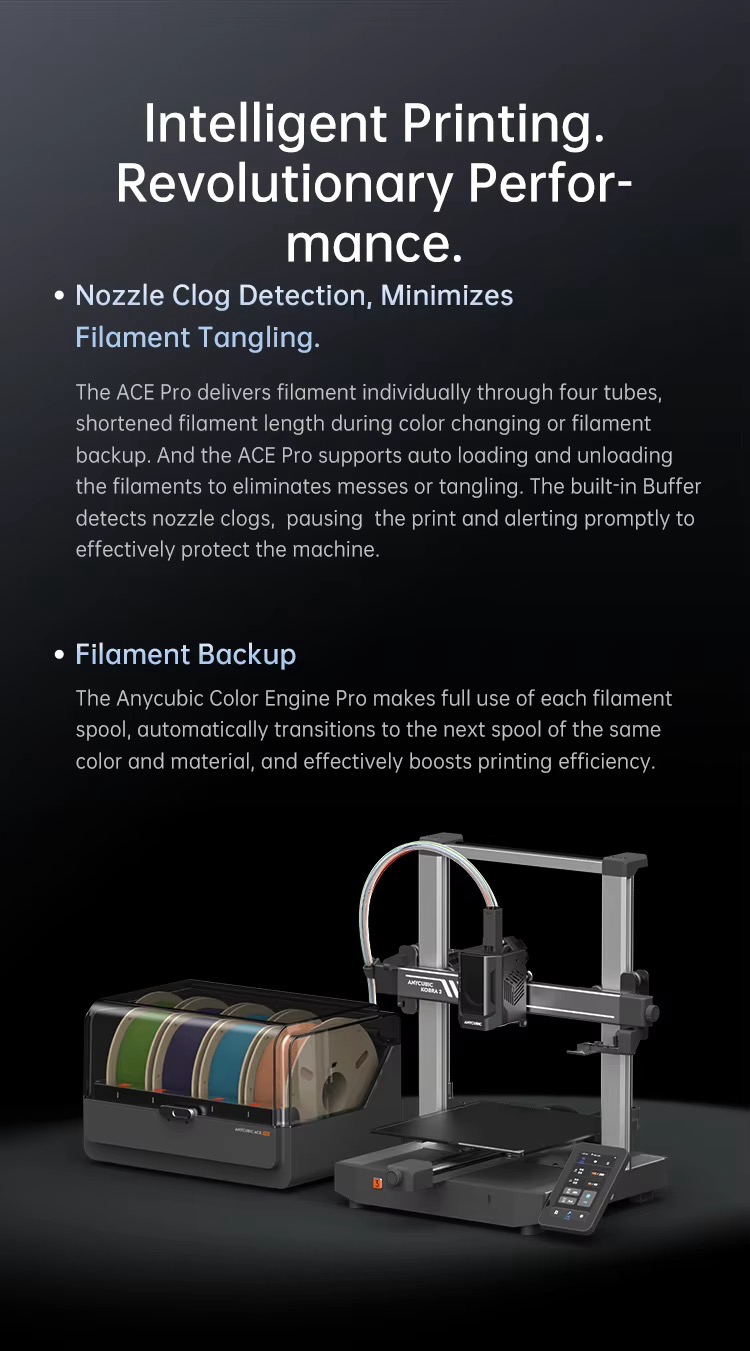 The ACE Pro delivers filament individually through four tubes, shortened filament length during color changing or filament backup . And the ACE Pro supports auto loading and unloading the filaments to eliminates messes or tangling. The built-in Buffer detects nozzle clogs, pausing the print and alerting promptly to effectively protect the machine.