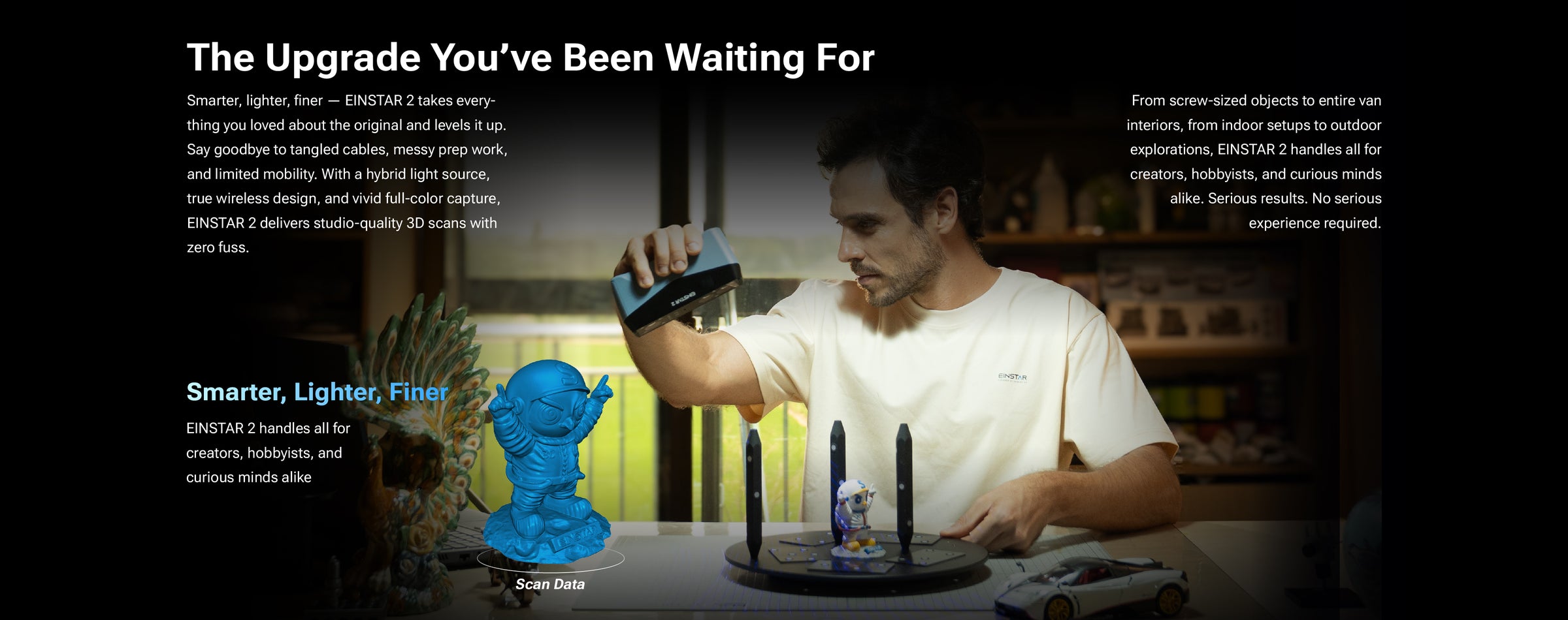New Shining 3D EINSTAR 2 is an affordable WIRELESS handheld 3D scanner, makes high-quality 3D data available to everyone. Einstar 2 delivers a major upgrade to the EINSTAR line. Featuring hybrid light sources (Blue Laser line and IR Rapid VCSEL), this portable 3D scanner combines wireless freedom with vivid full-color capture and marker-free scanning for true-to-life 3D models.